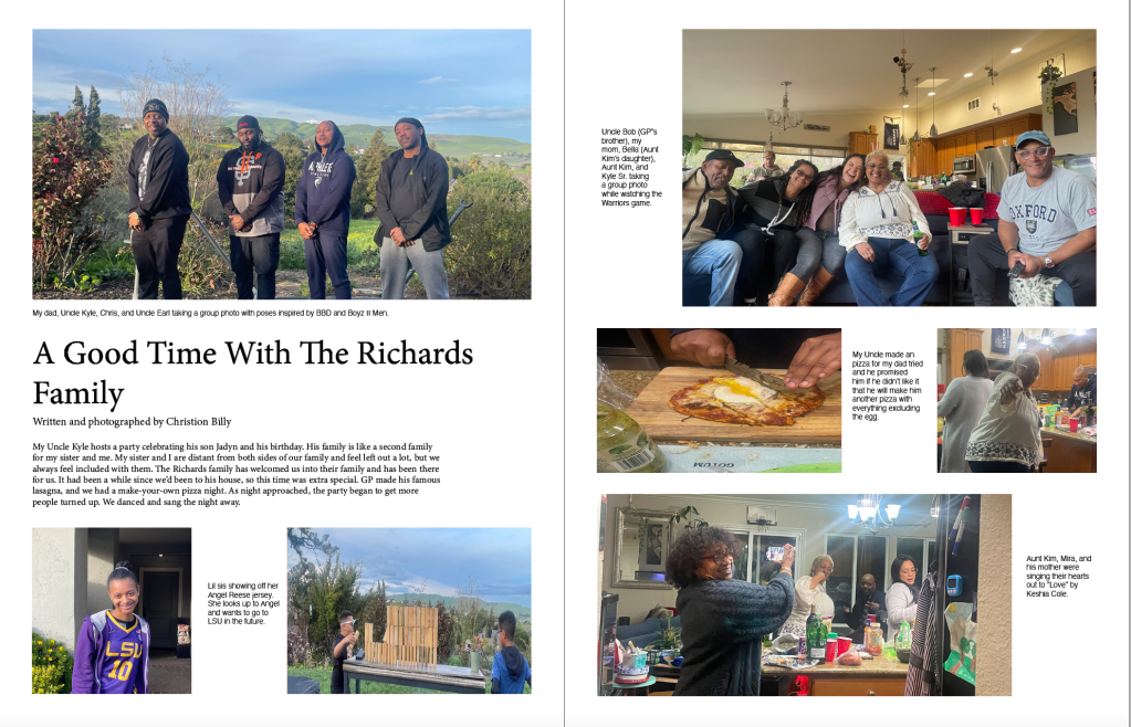 Create a photo essay around an event or topic using InDesign. I decided to do a photo essay on family coming together to have a good time. This essay features my Uncle’s family the Richards and it shows how everyone has a good time when we get together.